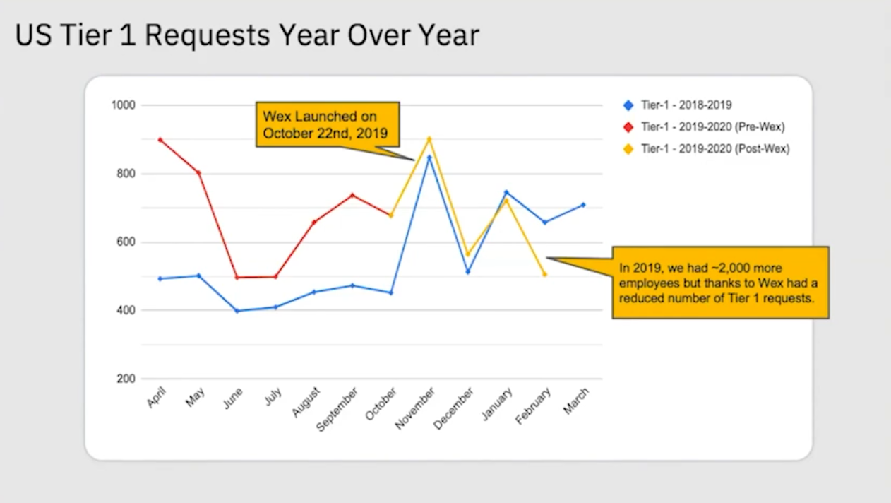 특히 그래프에서와 같이, 직원 수 대비 Tier1 지원 티켓 수는 꾸준히 감소하고 있습니다.